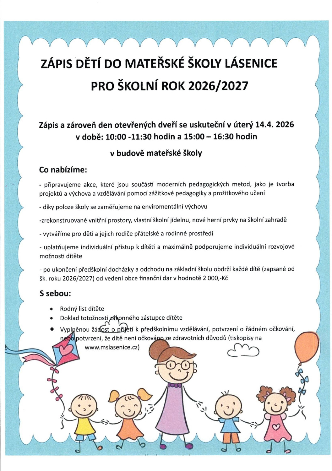 Zápis dětí do Mateřské školy Lásenice, pro školní rok 2026/2027 a zároveň den otevřených dveří, proběhne v úterý 14.4.2026 v době od 10.00 do 11.30 a v odpoledních hodinách od 15.00 do 16.30, v budově mateřské školy.
